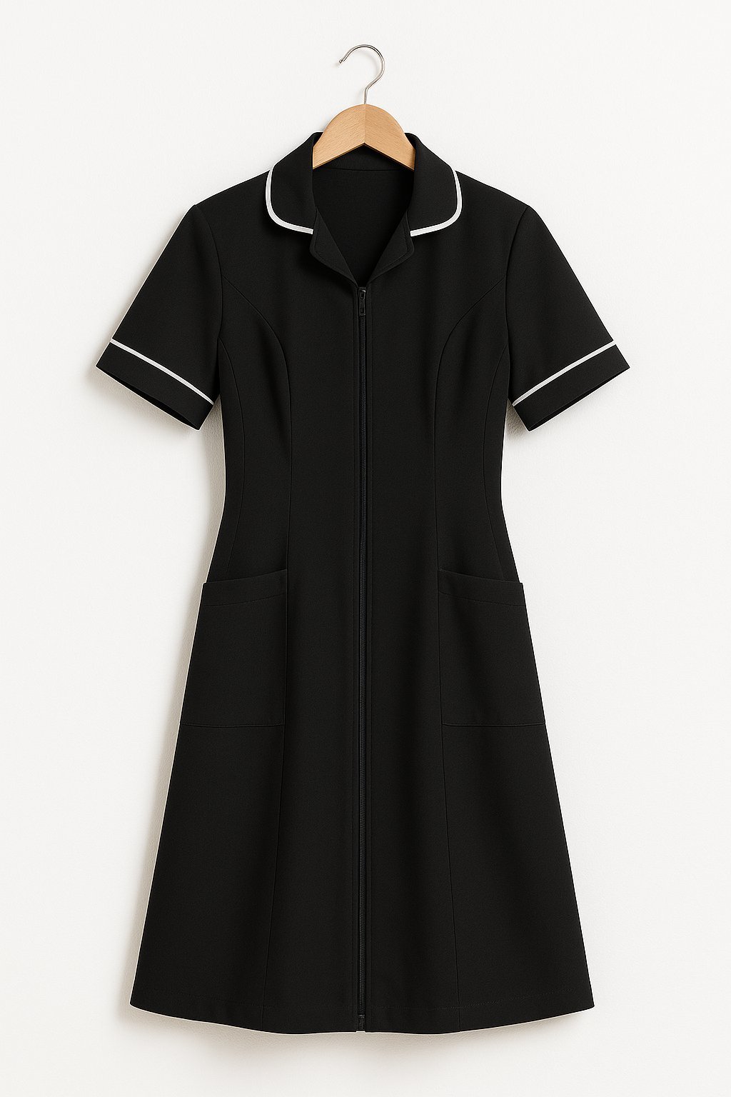 The Zip Front Nurses Dress is a timeless nurse dress that blends practicality with a polished look. Lightweight, breathable fabric keeps you comfortable during long shifts, while a tailored fit ensures professional presentation. Multiple pockets provide space for essential items, and the durable construction stands up to frequent washing. Perfect for healthcare professionals seeking comfort and style